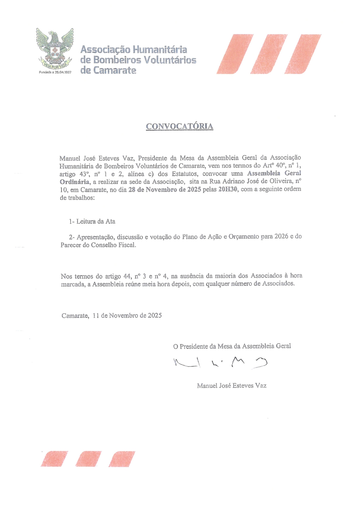 Convidamos todos os sócios a participarem na nossa Assembleia Geral Ordinária, que terá lugar no próximo dia 28 novembro, pelas 20h30, no Salão nobre da Associação Humanitária de Bombeiros Voluntários de Camarate